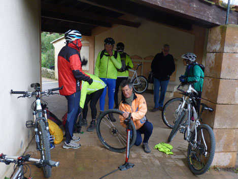 | Samedi 27: il pleut, il pleut! mais, l'effet de groupe jouant, nous partirons quand même sur le circuit prévu. Et nous rentrerons trempés, frigorifiés après avoir court-circuité la fin du parcours. | |