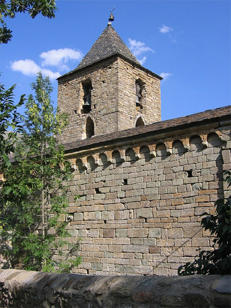 Sant Climent de Taül: édifice du XIè siècle le mieux conservé de la vallée, formé de trois nefs, chacune terminée par une abside semi-circulaire. magnifique clocher de style lombard à six étages. Chaque étage est décoré d'arcatures lombardes surmontées d'une frise à dent d'engrenage. Fenêtres simple, à double ou triple arcade. |
