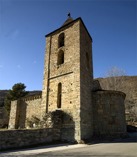 Santa Eulàlia d'Erill la Vall: église du XIè et XIIè siècle à une seule nef terminée par trois absides semi-circulaires. Clocher à six étages de style lombard. L'entrée est située sur la façade nord et est protégée par un porche formé d'arcs en plein cintre soutenus par des piliers circulaires. |